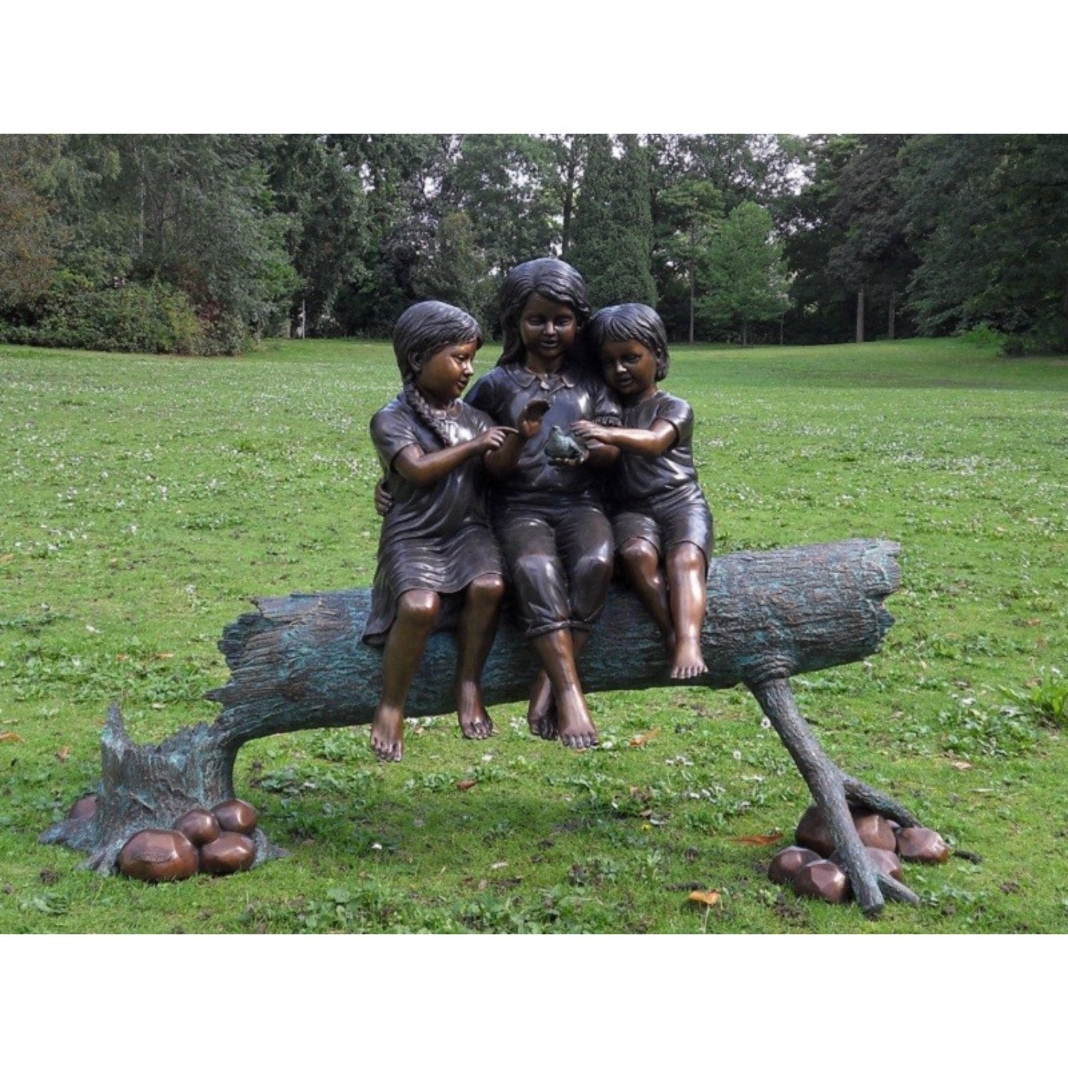 Die Bronzestatue „3 Mädchen auf einem Stamm“ (97 x 43 x 120 cm (HxBxL)) zeichnet sich durch ihre lebendige Patina aus, die durch einen sorgfältigen chemischen Prozess entsteht, der die natürliche Gelb- oder Kupferfarbe der Bronze in kräftige Farbtöne wie tiefes Braun, Grün oder Schwarz umwandelt. Dies verleiht jedem Bild ein einzigartiges Aussehen und sorgt dafür, dass es in jeder Umgebung Aufmerksamkeit erregt. Ob drinnen oder draußen platziert, es bleibt ein markantes Kunstwerk.