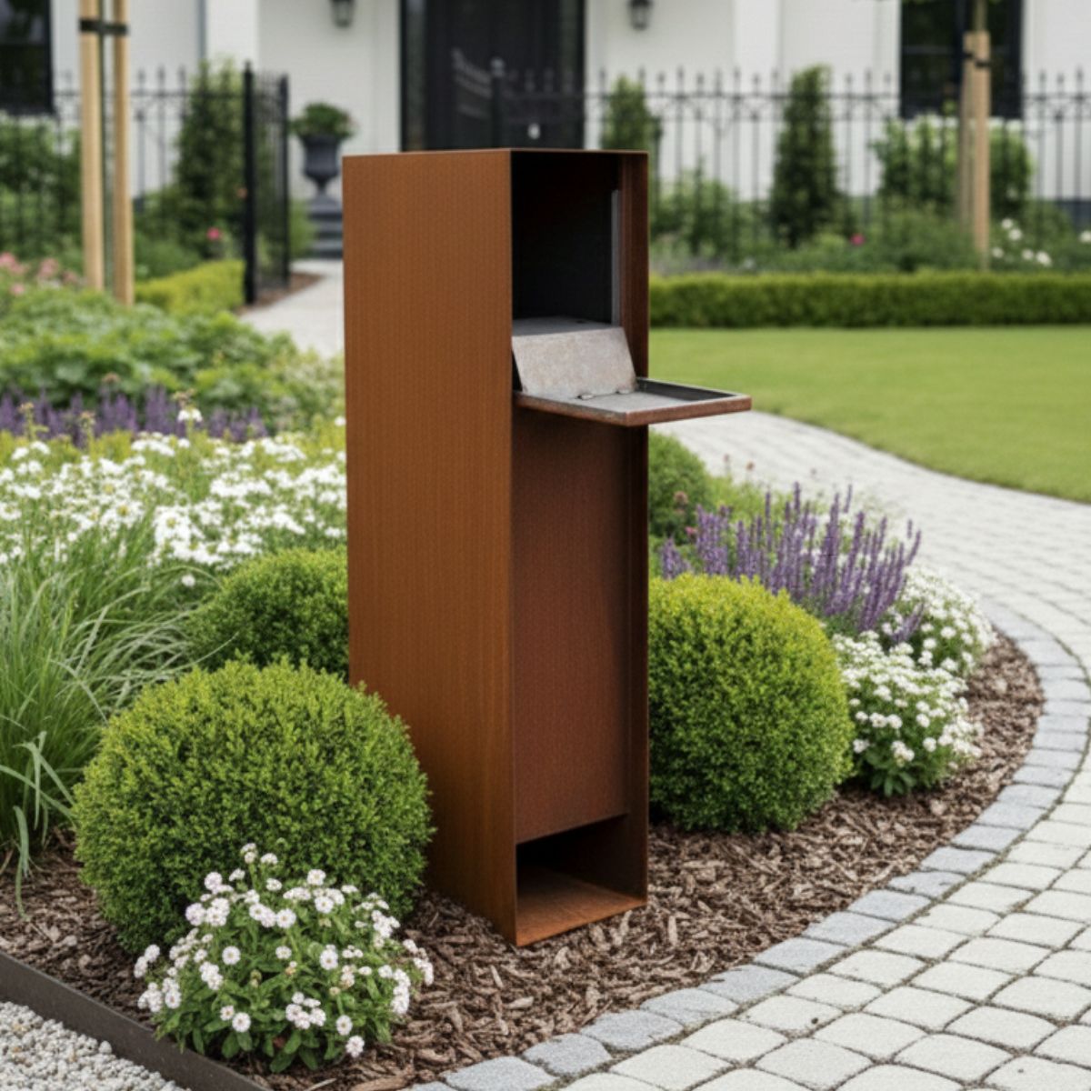 Cortenstahl ist bekannt für seine Langlebigkeit und Wartungsfreundlichkeit. Anstatt zu rosten, bildet das Material im Laufe der Zeit eine schützende Rostschicht. Dies sorgt nicht nur für zusätzlichen Schutz, sondern verleiht dem Briefkasten auch ein warmes, natürliches Aussehen, das sich wunderbar in jeden Garten oder jede moderne Auffahrt einfügt.