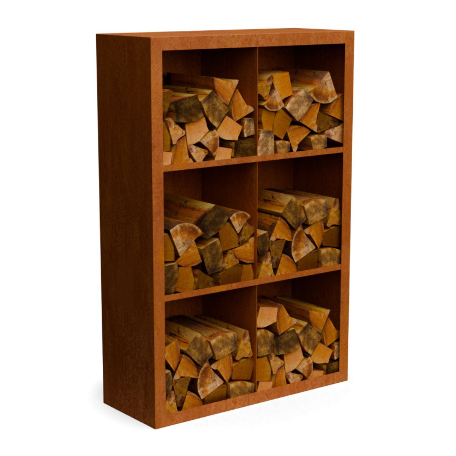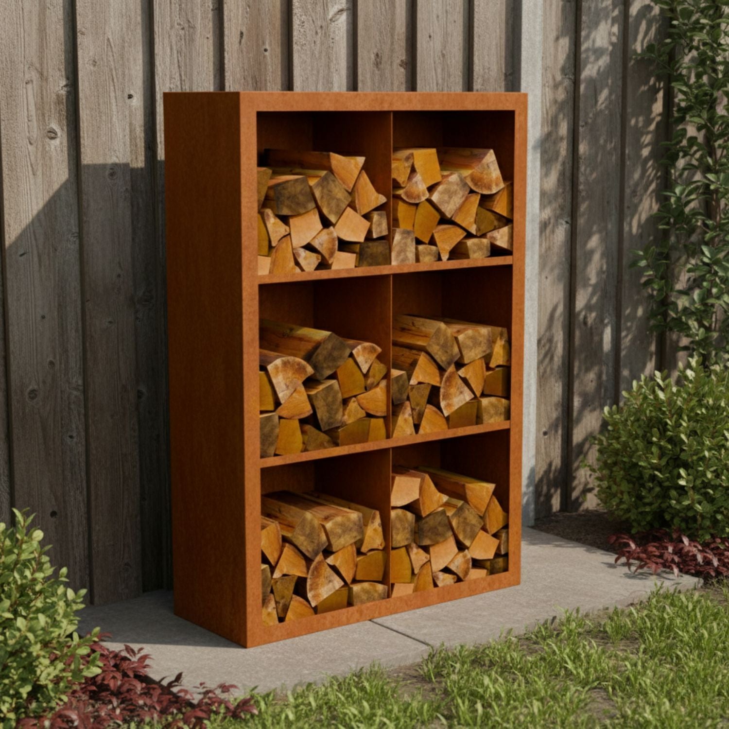 Dieser Holzspeicher aus Cortenstahl 100 x 38,5 x 150 cm mit 6 Fächern ist mit einer Schutzschicht versehen, die bei Kontakt mit der Außenluft eine schöne natürliche Rostfarbe entwickelt. Diese Farbe bildet in Kombination mit dem Holz eine optisch ansprechende Kombination, die sowohl in klassische als auch in moderne Gärten perfekt passt.