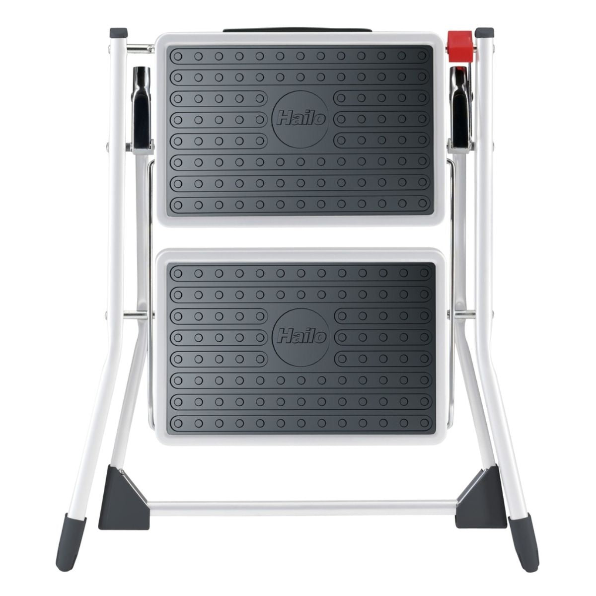 Die beiden geräumigen Trittstufen sind mit Antirutschmatten für optimalen Halt ausgestattet. In Kombination mit den stabilen Kunststofffüßen und dem praktischen Griff arbeiten Sie sicher und stabil.