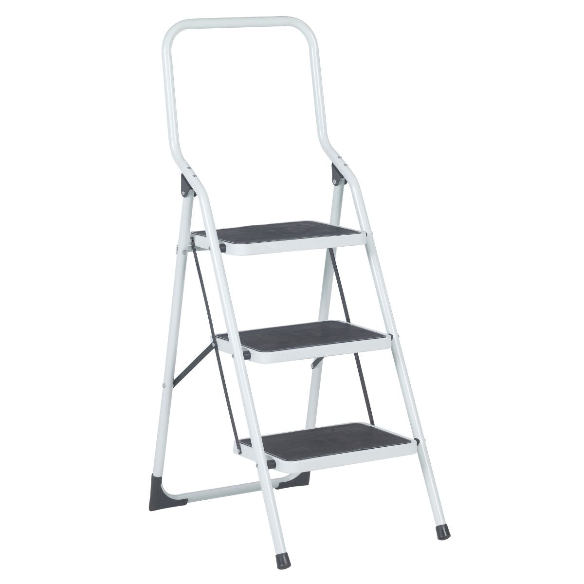 Die automatische Verriegelung hält die Trittleiter sicher an ihrem Platz, sobald Sie darauf treten. Die rutschfesten Füße sorgen für zusätzlichen Halt auf verschiedenen Oberflächen, während der hohe Sicherheitsbügel Ihnen zusätzliche Sicherheit beim Auf- und Absteigen bietet.