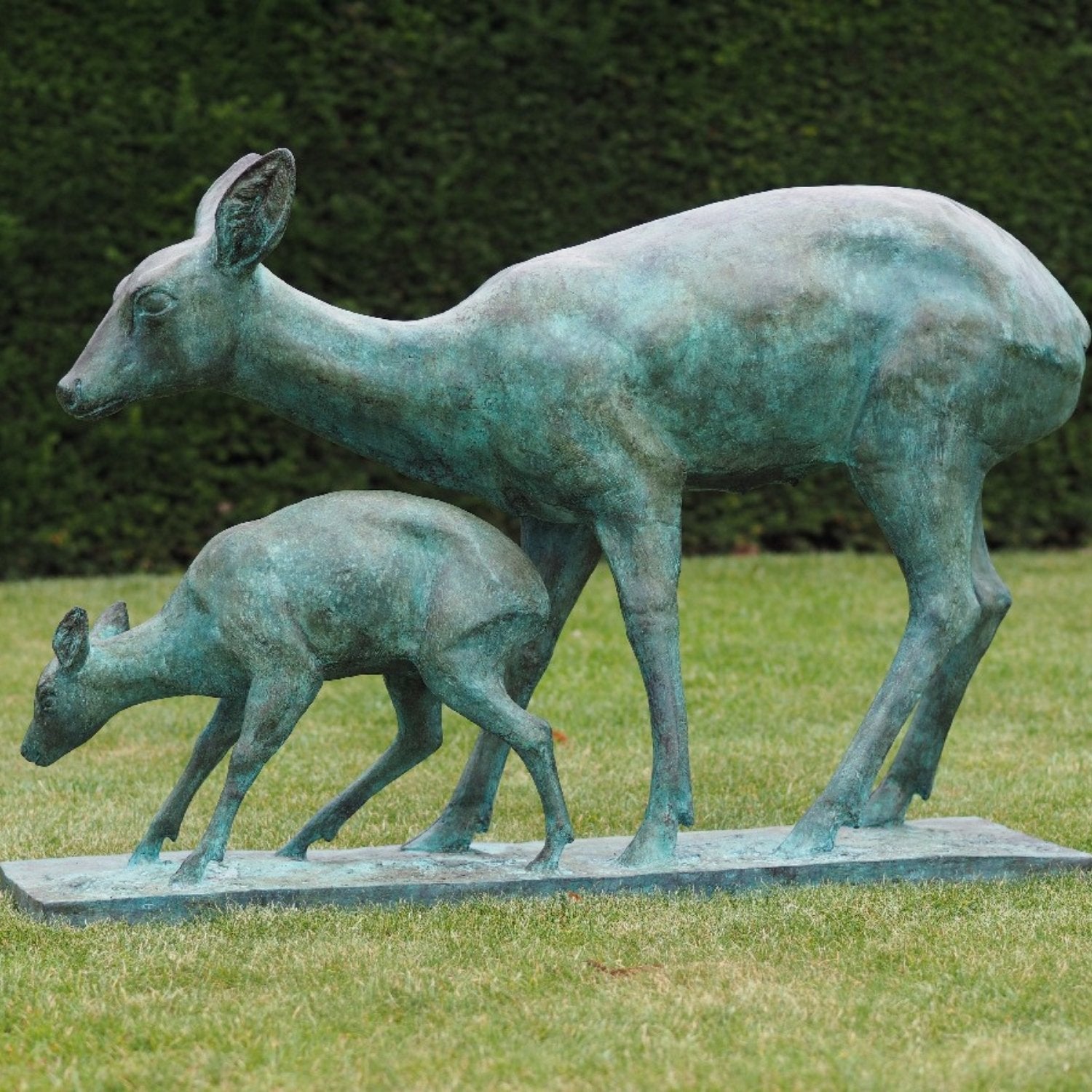 Die Bronzestatue „Hirsch mit Baby“ (80 x 35 x 115 cm (HxBxL)) zeichnet sich durch ihre lebendige Patina aus, die durch einen sorgfältigen chemischen Prozess entsteht, der die natürliche Gelb- oder Kupferfarbe der Bronze in kräftige Farbtöne wie tiefes Braun, Grün oder Schwarz umwandelt. Dies verleiht jedem Bild ein einzigartiges Aussehen und sorgt dafür, dass es in jeder Umgebung Aufmerksamkeit erregt. Ob drinnen oder draußen platziert, es bleibt ein markantes Kunstwerk.