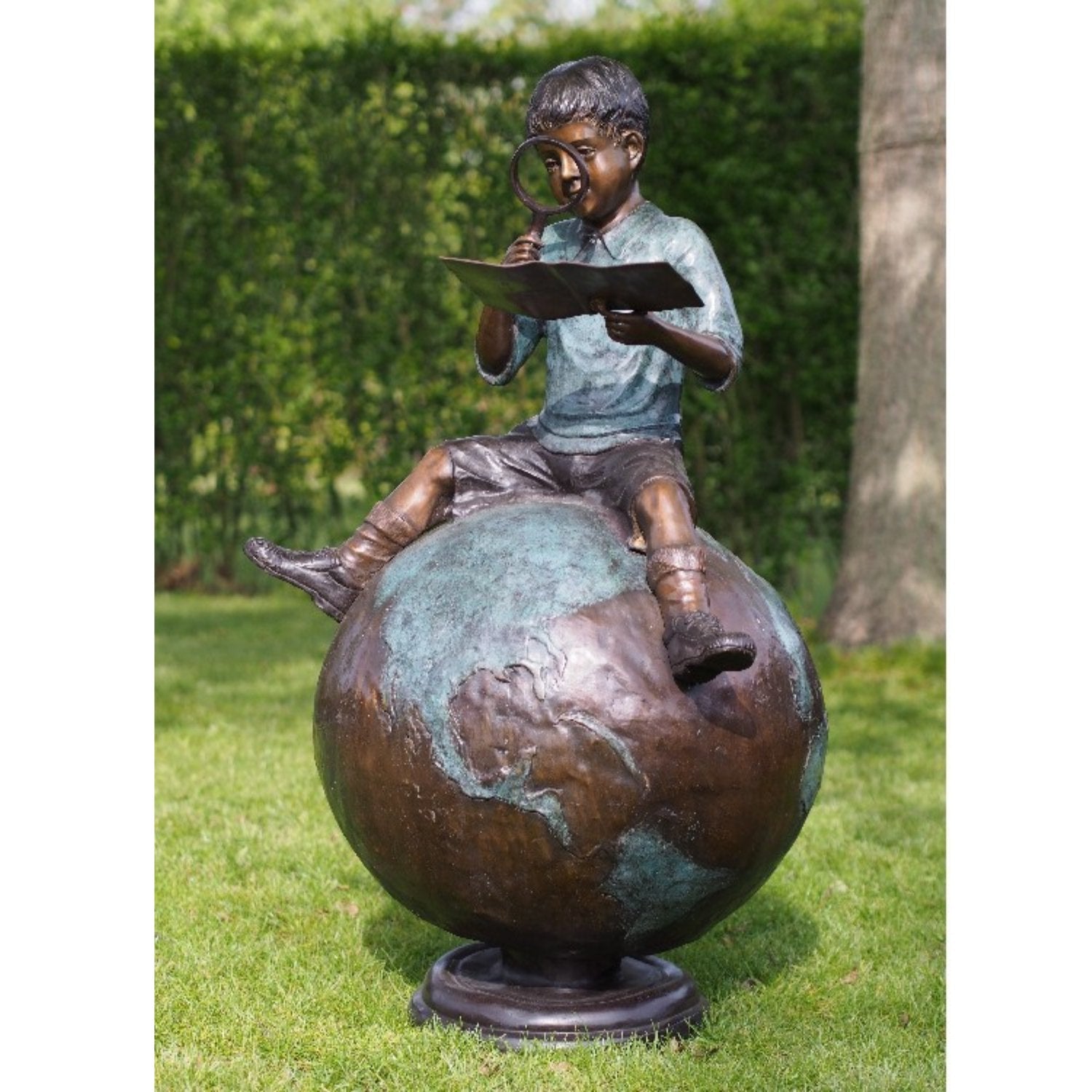 Mit der Bronzestatue eines auf einem Globus sitzenden Jungen in den Maßen 126 x 72 x 60 cm (HxBxL) entscheiden Sie sich nicht nur für eine schöne Ergänzung Ihrer Sammlung, sondern auch für ein Stück Ewigkeit, das über Generationen hinweg strahlen wird.