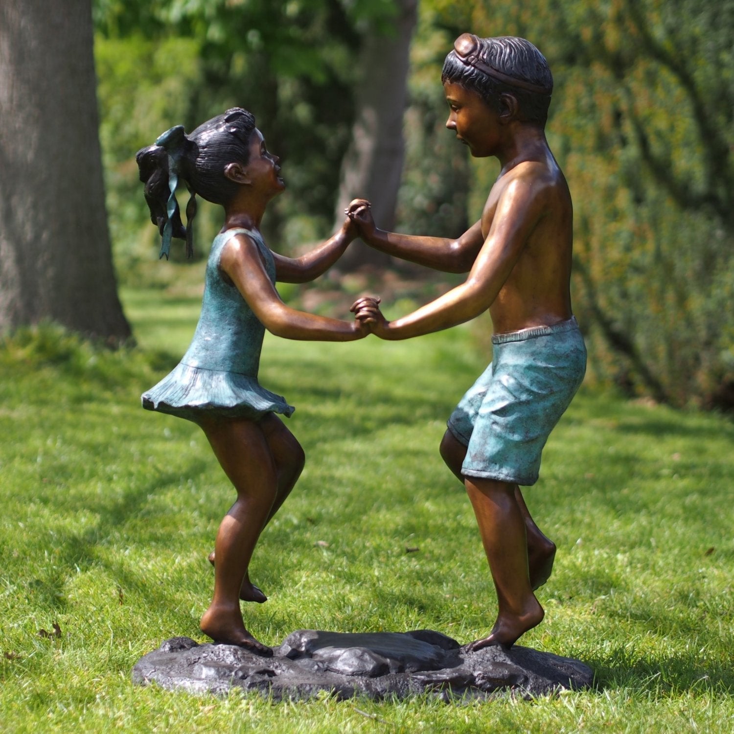 Die Bronzeskulptur Junge und Mädchen tanzen (92 x 35 x 60 cm (HxBxL)) zeichnet sich durch ihre lebendige Patina aus, die durch einen sorgfältigen chemischen Prozess entsteht, der die natürliche Gelb- oder Kupferfarbe der Bronze in kräftige Farbtöne wie tiefes Braun, Grün oder Schwarz umwandelt. Dies verleiht jedem Bild ein einzigartiges Aussehen und sorgt dafür, dass es in jeder Umgebung Aufmerksamkeit erregt. Ob drinnen oder draußen platziert, es bleibt ein markantes Kunstwerk.