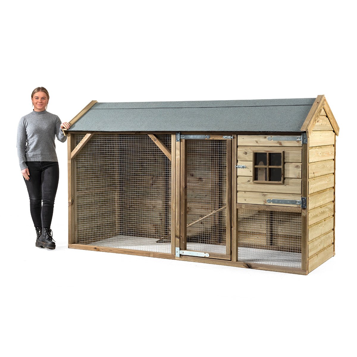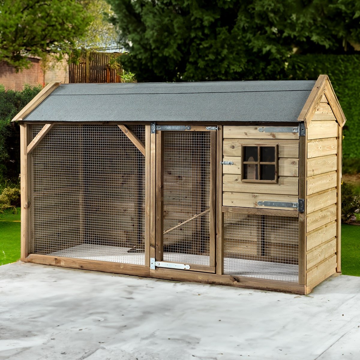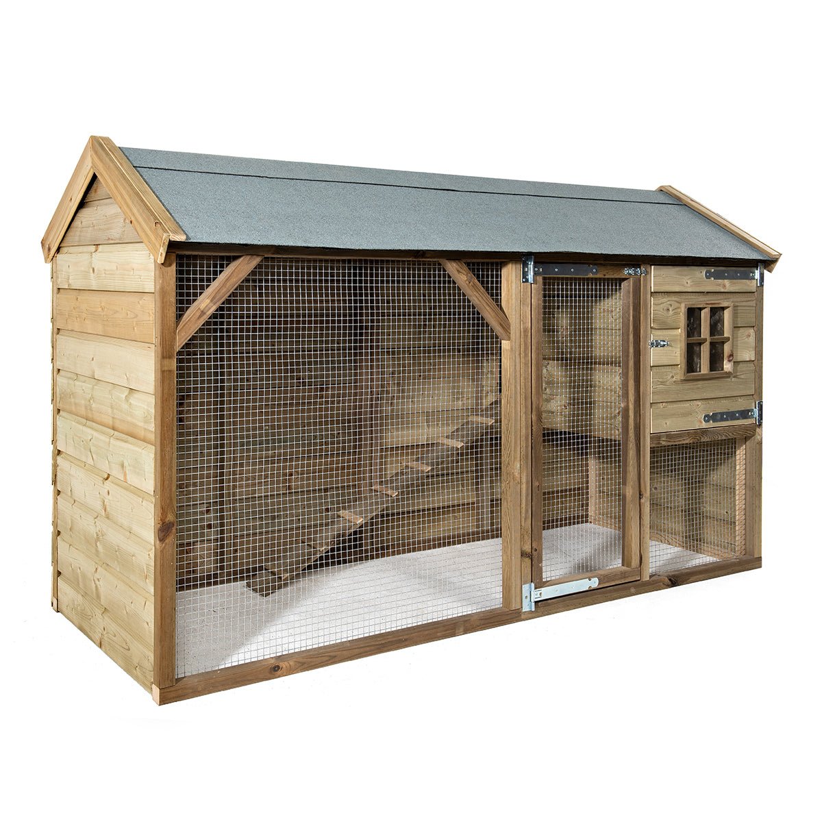 - Gefertigt aus imprägniertem Kiefernholz und ausgestattet mit Betonmultiplexplatte als Bodenplatte im Schlafhaus