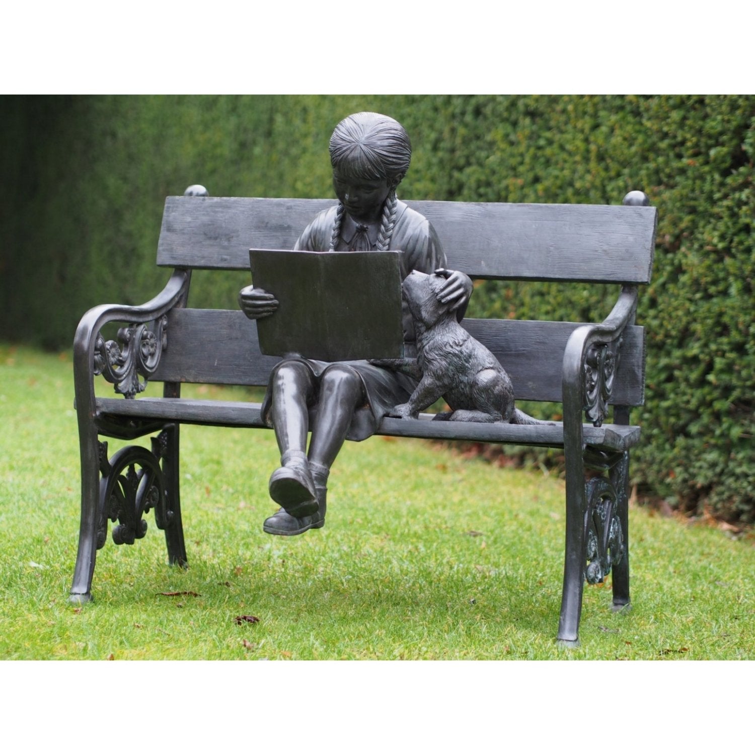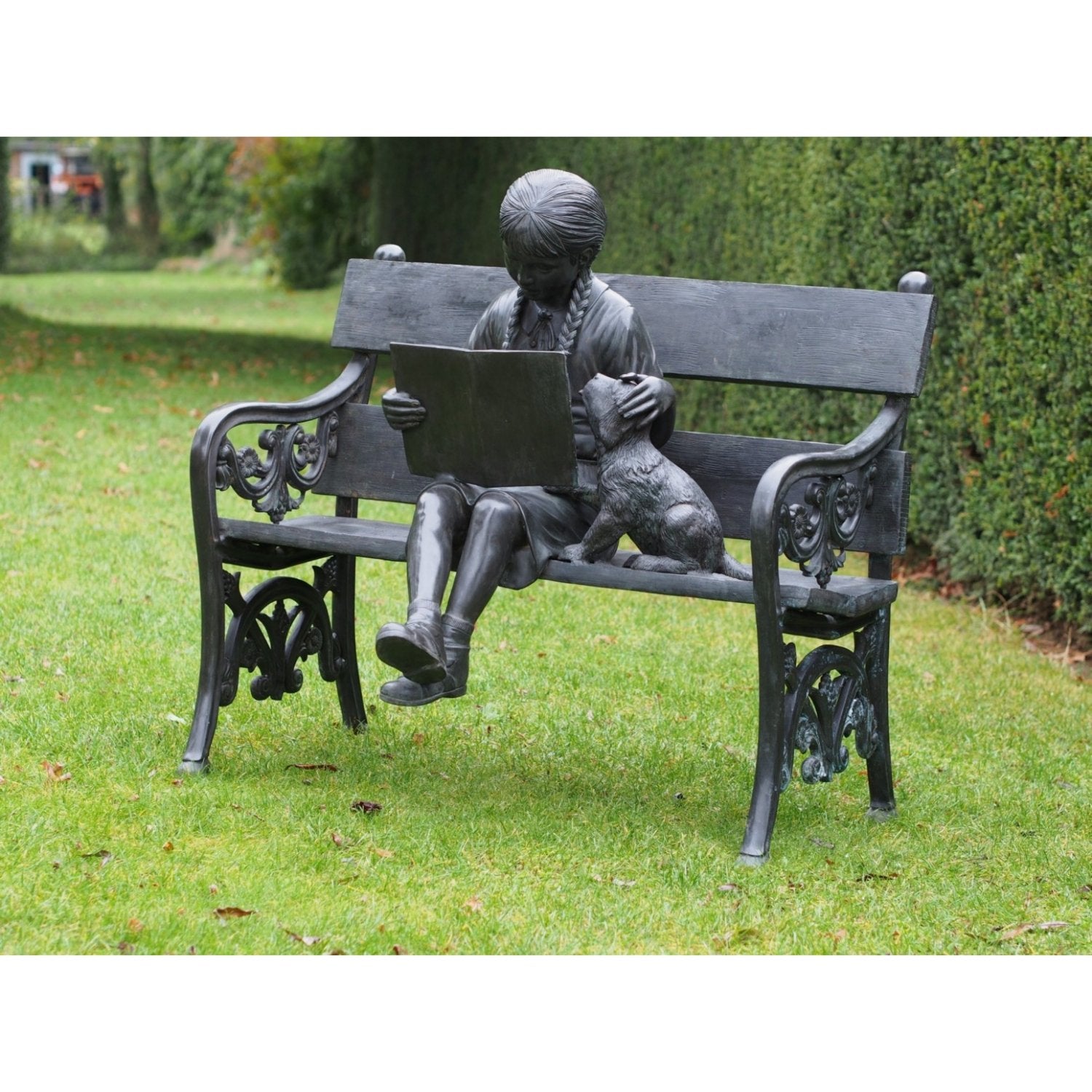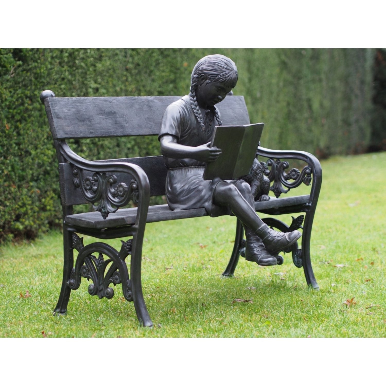 Die Bronzeskulptur „Mädchen auf Bank“ (80 x 65 x 102 cm (HxBxL)) zeichnet sich durch ihre lebendige Patina aus, die durch einen sorgfältigen chemischen Prozess entsteht, der die natürliche Gelb- oder Kupferfarbe der Bronze in kräftige Farbtöne wie tiefes Braun, Grün oder Schwarz umwandelt. Dies verleiht jedem Bild ein einzigartiges Aussehen und sorgt dafür, dass es in jeder Umgebung Aufmerksamkeit erregt. Ob drinnen oder draußen platziert, es bleibt ein markantes Kunstwerk.