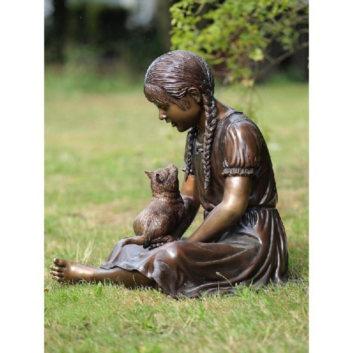 Die Bronzeskulptur „Mädchen mit Katze“ (62 x 45 x 55 cm (HxBxL)) zeichnet sich durch ihre lebendige Patina aus, die durch einen sorgfältigen chemischen Prozess entsteht, der die natürliche Gelb- oder Kupferfarbe der Bronze in kräftige Farbtöne wie tiefes Braun, Grün oder Schwarz umwandelt. Dies verleiht jedem Bild ein einzigartiges Aussehen und sorgt dafür, dass es in jeder Umgebung Aufmerksamkeit erregt. Ob drinnen oder draußen platziert, es bleibt ein markantes Kunstwerk.