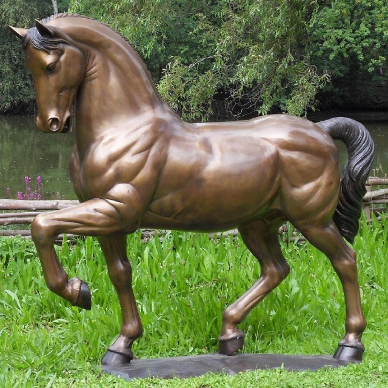 Die bronzene Pferdestatue mit den Maßen 127 x 36 x 148 cm (HxBxL) zeichnet sich durch ihre lebendige Patina aus, die durch einen sorgfältigen chemischen Prozess entsteht, der die natürliche Gelb- oder Kupferfarbe der Bronze in kräftige Farbtöne wie tiefes Braun, Grün oder Schwarz umwandelt. Dies verleiht jedem Bild ein einzigartiges Aussehen und sorgt dafür, dass es in jeder Umgebung Aufmerksamkeit erregt. Ob drinnen oder draußen platziert, es bleibt ein markantes Kunstwerk.