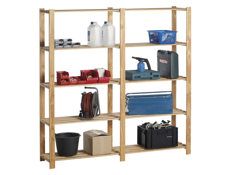 Suchen Sie nach einem besonders stabilen, geräumigen und eleganten Lagerregal, das mühelos große Mengen an Sachen transportieren kann? Dieses **doppelte Lagerregal aus Holz** mit fünf Regalböden ist die ideale Lösung für alle, die maximale Lagerkapazität mit natürlicher Optik und Stabilität kombinieren möchten. Dank der robusten 18 mm starken Latten, der stabilen Schraubverbindungen und der großzügigen Breite von 175 cm eignet sich dieses Regal ideal für Garagen, Abstellräume, Hobbyräume oder als markantes und praktisches Möbelstück im Wohnbereich.