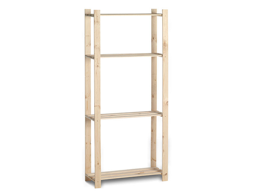 Das Regal ist aus Naturholz gefertigt, was ihm einen rustikalen, zeitlosen Look verleiht, der zu jeder Inneneinrichtung passt. Die luftige Konstruktion mit drei Lamellen pro Diele lässt es leicht und offen wirken. Das Holz ist unbehandelt und lässt sich daher ganz einfach mit Lack oder Farbe individuell gestalten, ganz nach Ihrem Stil.