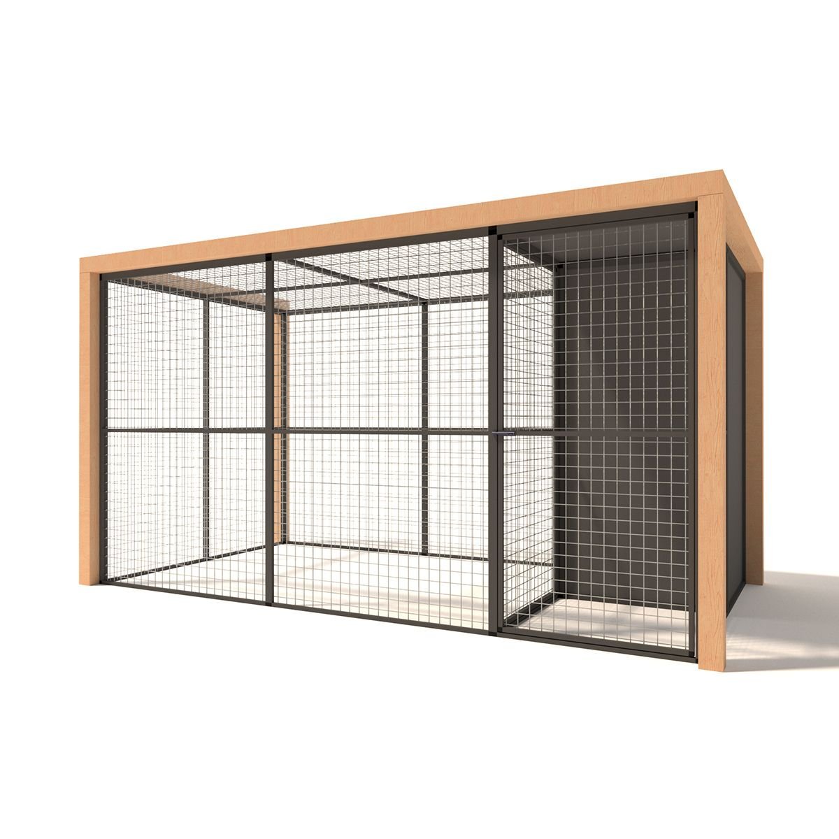 Materialien: Aluminiumrahmen, Douglas-Holzpfosten und ACP-Paneele für den Nachtkäfig.