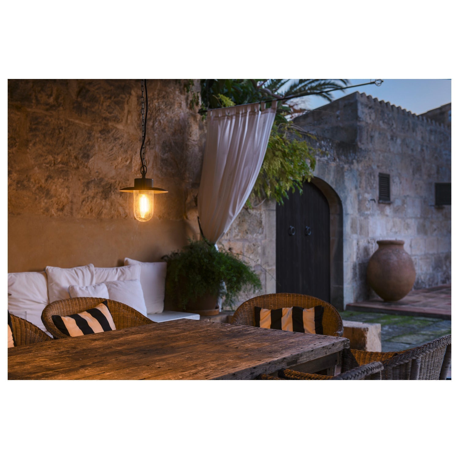 Elegantes Design: Zeitlose Hängelampe, ideal für Außenbereiche.