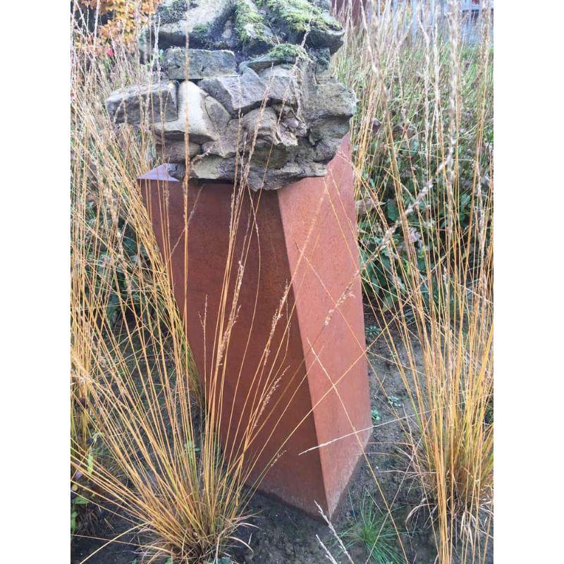 Cortenstahl ist eine Metalllegierung aus Eisen, verstärkt mit Kupfer, Phosphor, Silizium, Nickel und Chrom. Bei Kontakt mit der Außenluft bildet sich eine schützende Rostschicht, die weitere Korrosion verhindert und die Lebensdauer des Sockels deutlich verlängert. Dies macht den Sockel zu einer nachhaltigen Wahl für jeden Gartenliebhaber.