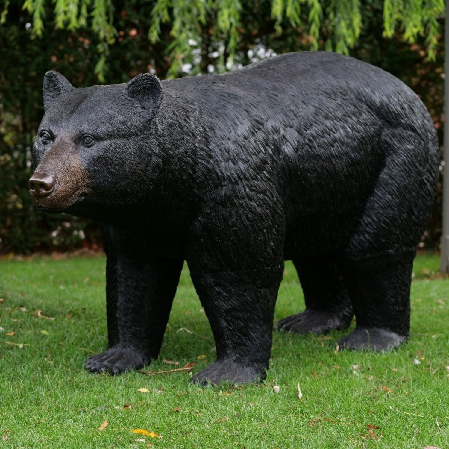 Die bronzene Bärenstatue mit den Maßen 98 x 55 x 185 cm (HxBxL) zeichnet sich durch ihre lebendige Patina aus, die durch einen sorgfältigen chemischen Prozess entsteht, der die natürliche Gelb- oder Kupferfarbe der Bronze in kräftige Farbtöne wie tiefes Braun, Grün oder Schwarz umwandelt. Dies verleiht jedem Bild ein einzigartiges Aussehen und sorgt dafür, dass es in jeder Umgebung Aufmerksamkeit erregt. Ob drinnen oder draußen platziert, es bleibt ein markantes Kunstwerk.